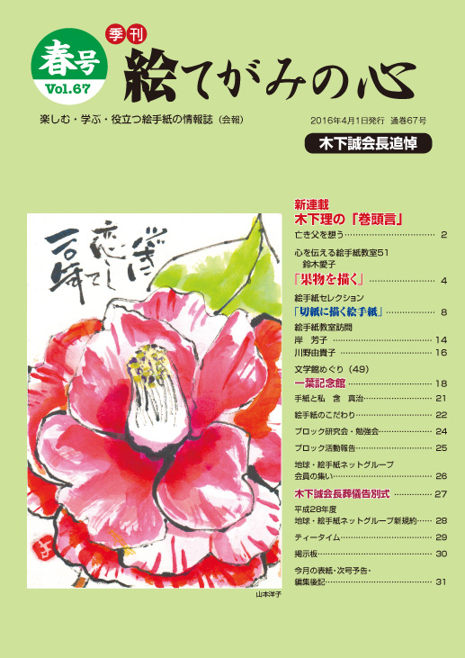 季刊誌「絵てがみの心春号」(67号)発売です。絵手紙教室は4月号から新しい試みとして地球・絵手紙ネットグループの特徴である多彩な筆記用具を使った絵手紙の描き方を紹介していきます。4月号は特別講師鈴木愛...